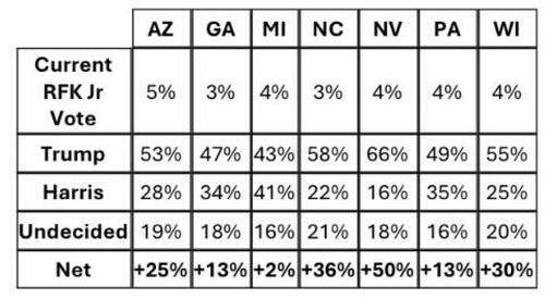 În plus, sondajele interne realizate de campania Trump au arătat că fostul preşedinte se bucură de un avans faţă de Harris în rândul susţinătorilor lui Kennedy în şapte state cruciale: Arizona, Georgia, Michigan, Carolina de Nord, Nevada, Pennsylvania şi Wisconsin.