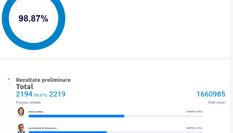 Maia Sandu a obţinut, potrivit datelor preliminare centralizate de Comisia Electorală Centrală (CEC), după numărarea voturilor din 99,68% din secţiile de votare, un scor de 55,35%, în timp ce contracandidatul său a fost votat de 44,65% dintre alegători.