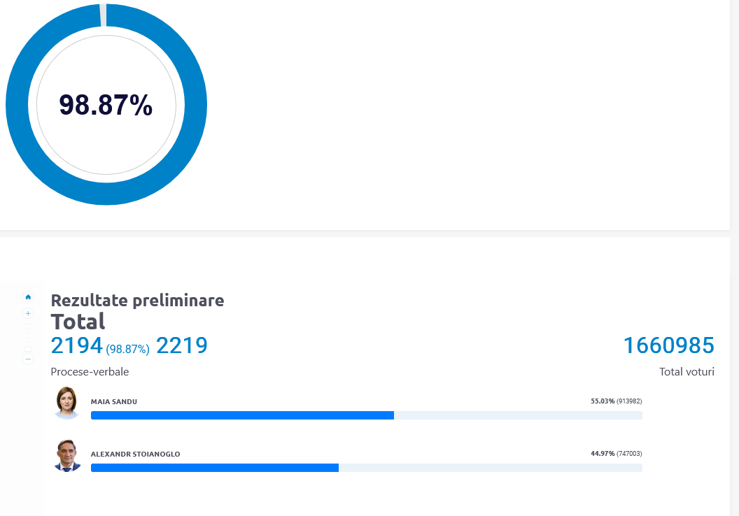 Până luni dimineaţă, la ora 07:30, CEC centralizase voturile a 1.676.284 alegători. Dintre aceştia, 927.805 au susţinut-o pe Maia Sandu, iar 748.479 pe Alexandr Stoianoglo.