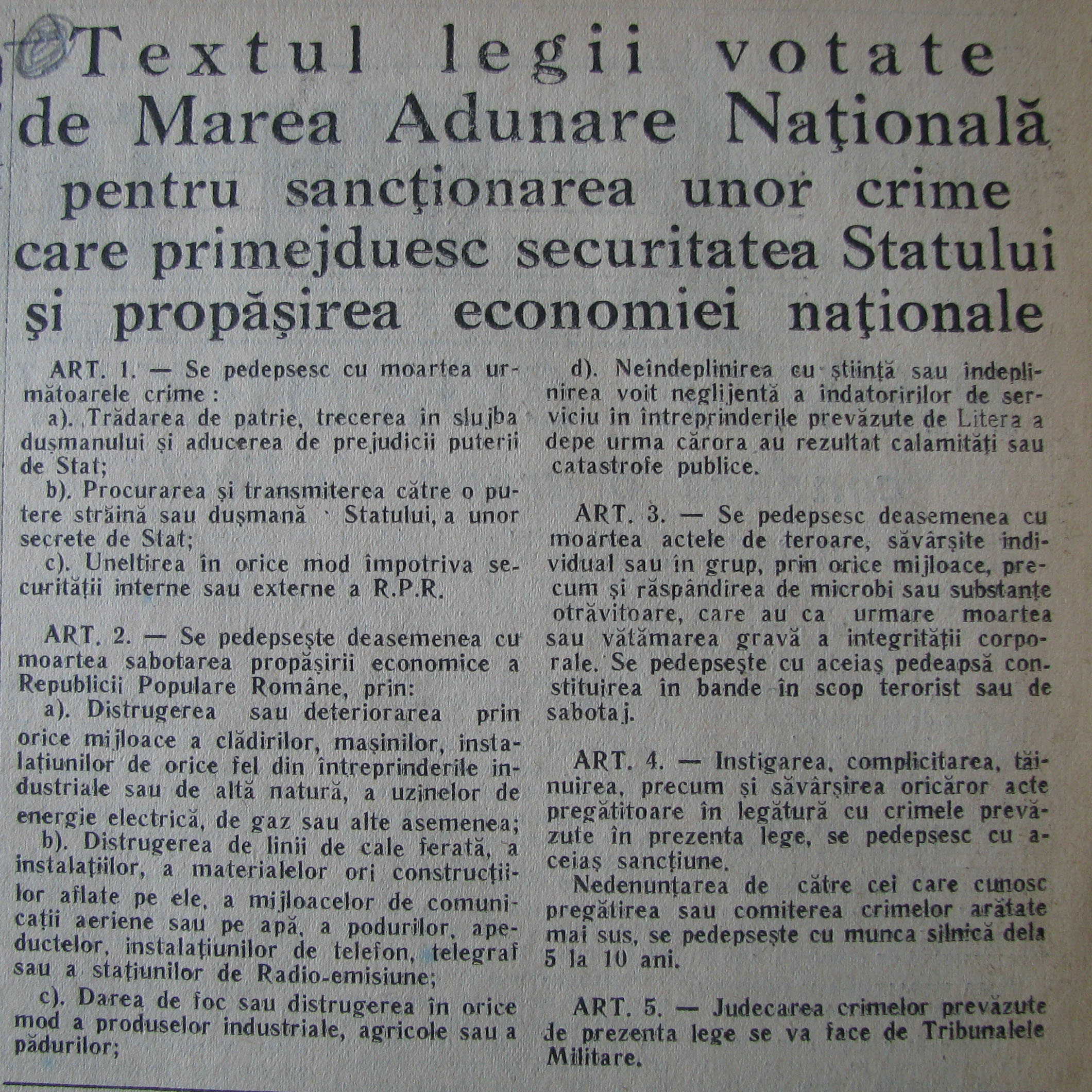 Return to "Memoria lunii ianuarie. 1949, legalizarea crimei de stat. Pedeapsa cu moartea" III-a Next Previous