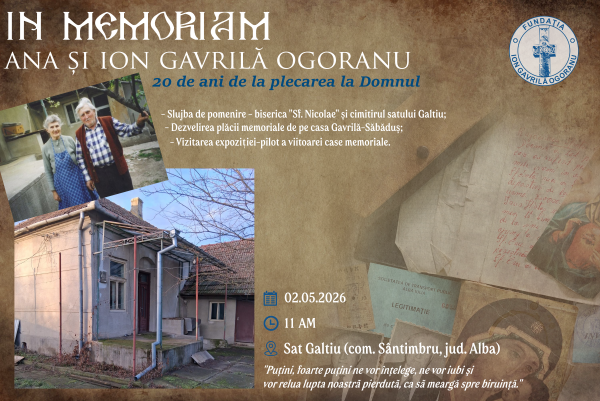 Sâmbătă 2.05.2026, ora 11, la Galtiu (com. Sântimbru, jud. Alba), va avea loc comemorarea religioasă prilejuită de împlinirea a 20 de ani de la trecerea în lumea drepților a legendarilor eroi ai Rezistenței anticomuniste Ana și Ion Gavrilă Ogoranu, care ne-au lăsat una din cele mai impresionante povești ale luptei pentru libertate.