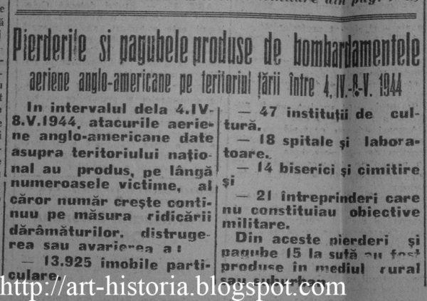 Oare erau americani crestini cei care au decis aceste bombardamente?Asta e-ntrebarea.Dusmanii poporului roman isi desfasoara aria criminltatii de-alungul istoriei si ataca cu orce ocazie ,mai ales atunci cand soarta ai aseaza temporar prin copaci,adica mai la inaltimea situatiei,de unde actioneaza ca bestiile.O simpla imagine a lumii dupa sfarsitul celor doua razboaie mondializate cu diplomatie,adica cu forta,arata clar cine a beneficiat de cele doua incrancenari sangeroase nonnecesare intre popoarele crestine ale Europei in special si a restullui umanitatii,Castigatorii au fost aceiasi.Eu cred ca asa trebue vazut bombardamentul din 1944 asupra oamenilor pasnici din Romania.Sitatia se vede clar a fi iesita din logica razbopiului,acte militare atipice razboiului.Razboiul,lupele armate se petreceau undeva pe front departe de viata care curgea totusi pasnica si aproape normala.Unde s-a bombardat nu era line de lupta armata.De unde se trage concluzia existentei unei uri permanente impotriva linistii,normalitatii,intelegerii si impacarii cu soarta a unui popor asezat pe culmile spiritualitatii.Cred ca acesta a fost singurul motiv al acelor bombardamente criminale ,ilogic petrecute d.p.v militar.A fost doar ura.Si rezultatul a fost o inca batae de joc tot pasnica privind amplasarea monumentelor aviatorilor criminali din Bucurestiul aniloe’44,victima a cestora.Cine a hotarat ridicarea acestor atroce artefacte?Cine castigase razboiul dpv.politic?URSS-ul si SUA.Cine era la conducerea celor doua puteri,rusii sau americanii crestini?Dati singuri raspunsul.