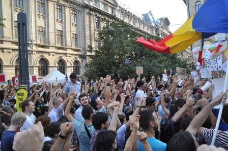 Peste 4000 de bucureşteni, în marea lor majoritate tineri se strânseseră în primele 2 ore după începerea protestelor. Ei au scandat lozinci cu caracter ecologist, în apărarea Roşiei Montane, împotriva guvernului Ponta – catalogat ca mincinos după ce şi-a încălcat propriul program de guvernare aprobând legea samavolnică a proiectului Roşia Montană, dar şi lozinci făcând apel la reluarea rezistenţei naţionale de acum 60 de ani.