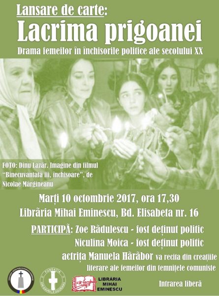 În cadrul unui proiect mai amplu al Asociaţiei „Gogu Puiu şi Haiducii Dobrogei” în parteneriat cu Fundaţia „Ion Gavrilă Ogoranu”, cu ocazia lansării cărţii, vom vorbi despre drama femeilor în închisorile politice ale secolului trecut, cu NICULINA MOICA şi ZOE RĂDULESCU, ambele foste deţinute politic în timpul regimului comunist, iar îndrăgita actriţă MANUELA HĂRĂBOR va recita din creaţiile literare ale femeilor din temniţele şi lagărele comuniste.