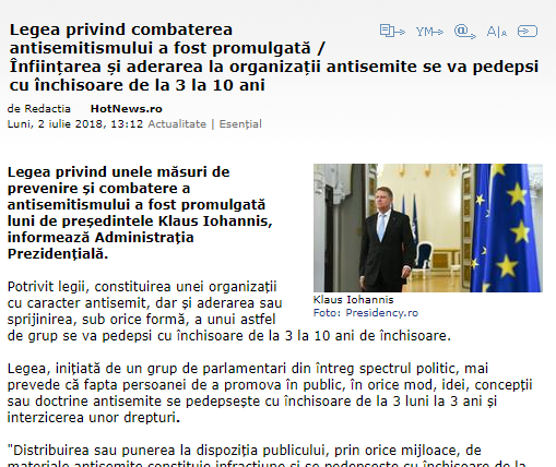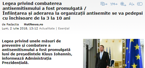 Și s-a întâmplat… Astăzi, Președintele Iohannis a promulgat Legea care pedepsește drastic antisemitismul. Aceasta fusese adoptată în urmă cu o săptămână.