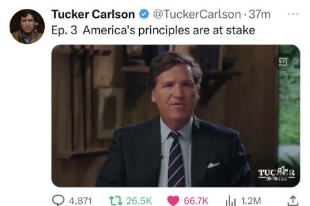 …şi asta ar trebui să va supere mai mult decât orice s-a întâmplat în politică americană în viaţa dumneavoastră……Da, Donald Trump este un om cu vicii; dar păcatele lui sunt minore în comparaţie cu cele ale persecutorilor săi”.Spectacolul urmăririi penale a lui Trump dezvăluie neputinţa alegătorilor din America şi, aşa cum încheie Carlson, îndemnând oamenii să păstreze democraţia: „Principiile Americii sunt în joc”.
