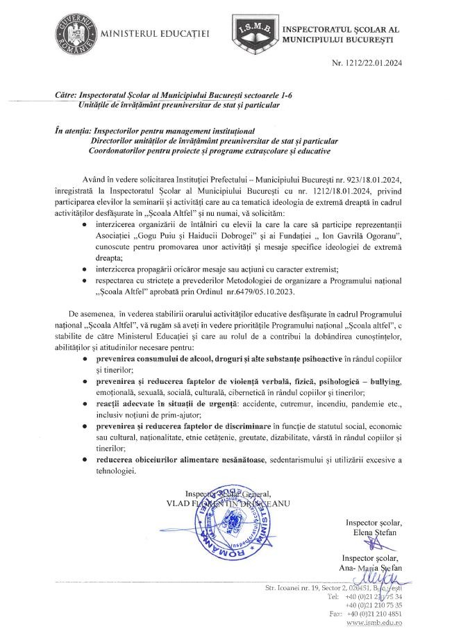 La doar câteva zile după acest moment, pe 22.01.2024, întreaga structură de conducere, organizare și control a unităților de învățământ de pe raza Bucureștiului (inspectori pentru managenent instituțional, directorii unităților de învățământ preuniversitar de stat și particular, coordonatorii pentru proiecte și programe exrtașcolare și educative) primesc o nouă adresă din partea ISMB ce repetă aceeași interdicție explicită și aceeași etichetare referitoare la cele două asociații mai sus numite, cu referire la „participarea elevilor la seminarii și activități care au ca tematică ideologia de extremă dreaptă în cadrul activităților desfășurate în <<Școala Altfel>> și nu numai”