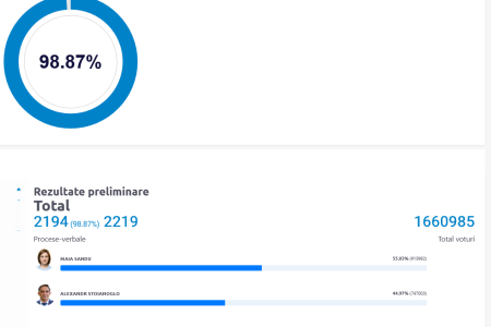 Până luni dimineaţă, la ora 07:30, CEC centralizase voturile a 1.676.284 alegători. Dintre aceştia, 927.805 au susţinut-o pe Maia Sandu, iar 748.479 pe Alexandr Stoianoglo.
